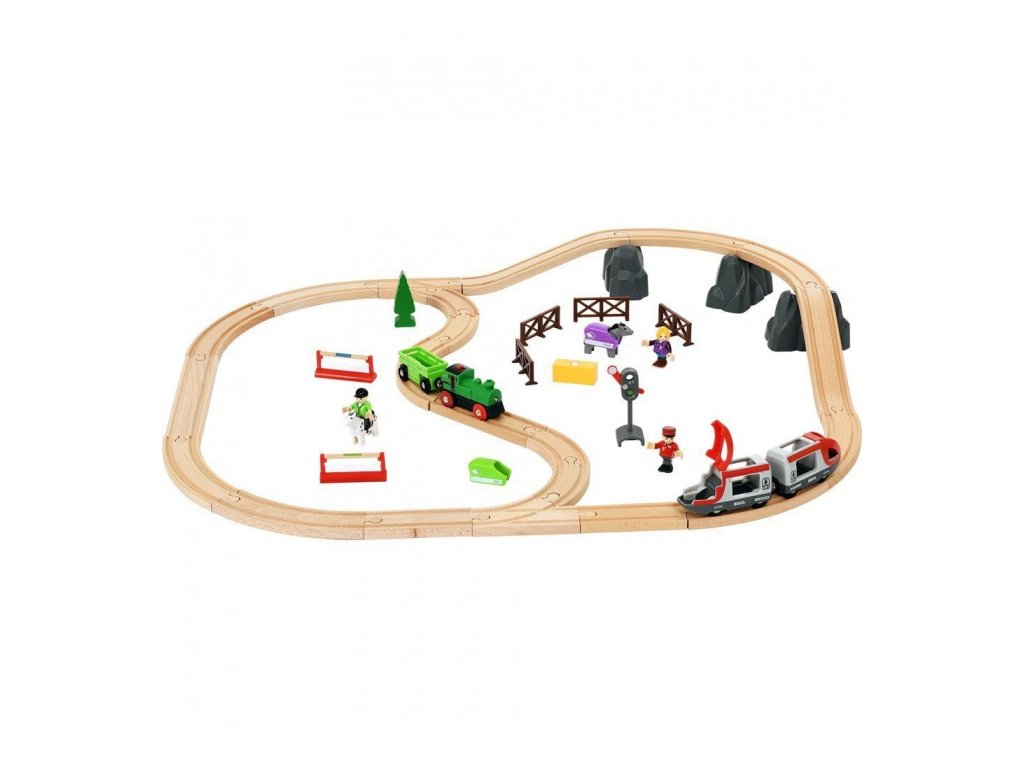 Vlaková souprava se skládá z různých vláčků, včetně jednoho s bateriovým pohonem. Hory, zvířata, postavy a další doplňky, v robustní plastové krabici pro snadné uložení.
