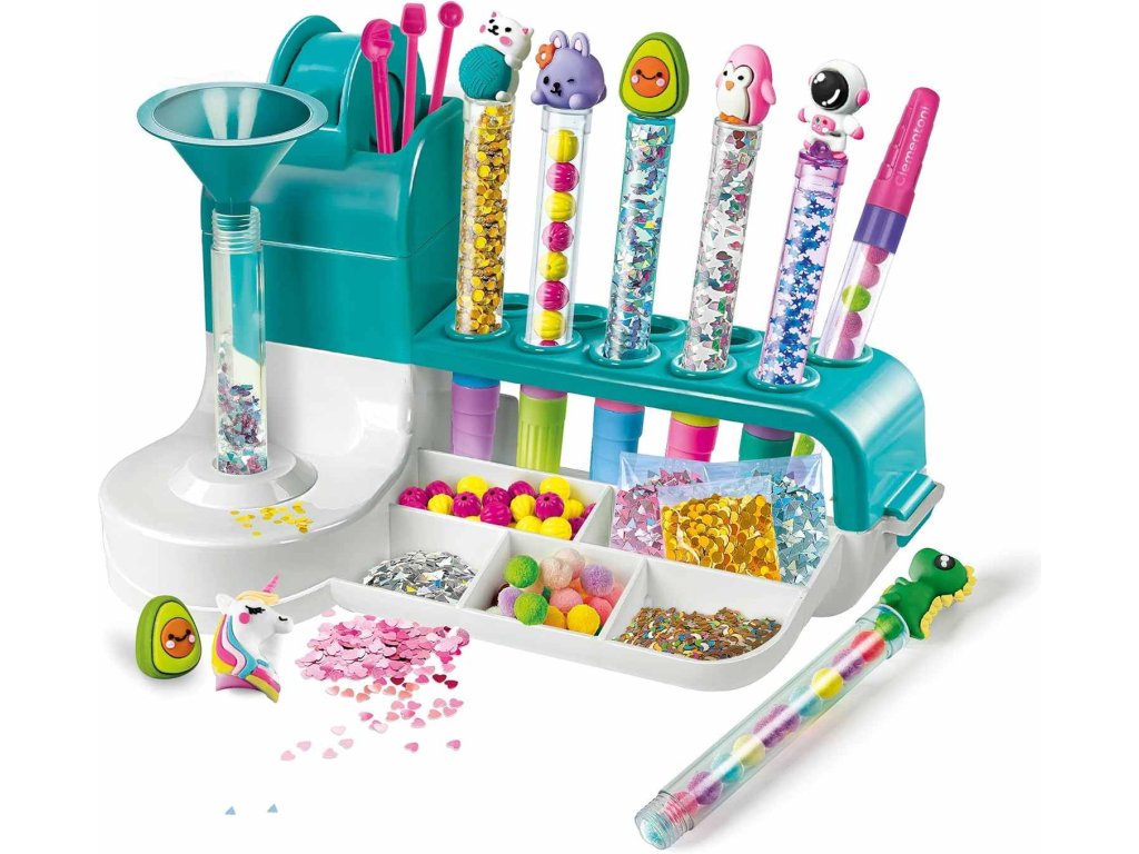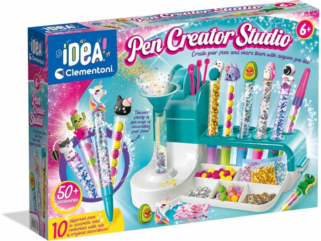 Staňte se malým designérem a vytvořte si vlastní originální pera! Tato kreativní dílna od Clementoni umožňuje dětem vyrábět a zdobit barevná pera pomocí více než 50 kouzelných doplňků. Praktický pracovní stůl a speciální nástroje podporují tvořivost a přinášejí radost z jedinečných výsledků. Perfektní dárek pro malé umělce a milovníky DIY!