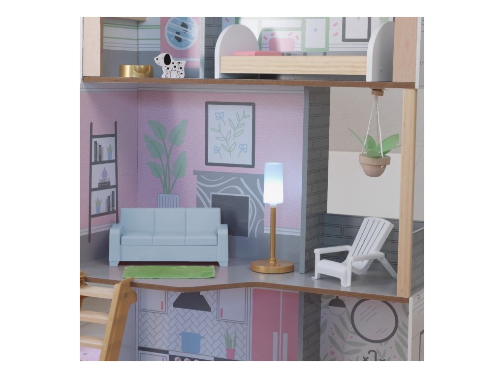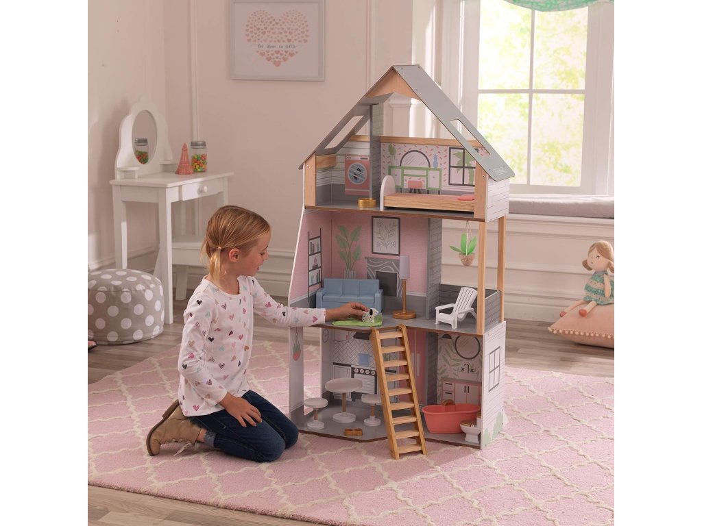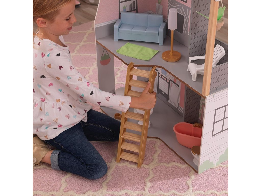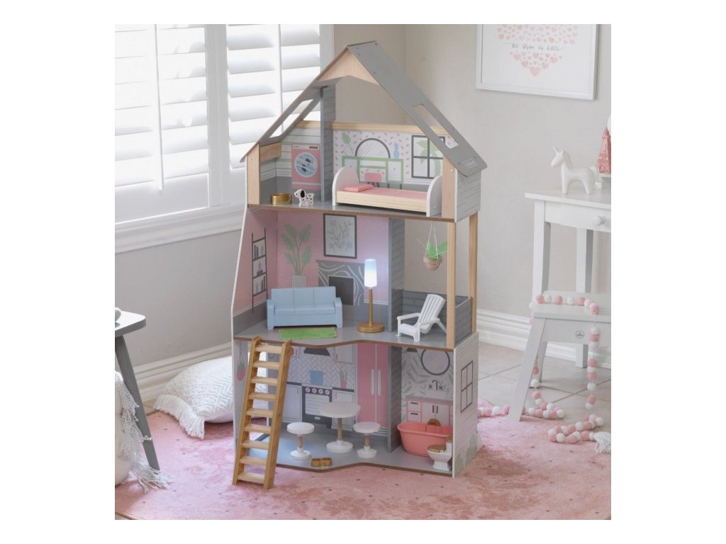 Dřevěný domeček pro panenky Alina má krásné pastelové barvy, moderní. Je vhodný i do menších prostorů. Ve třech podlažích je vše, co je ke hře s panenkou potřeba. V přízemí se nachází prostorná kuchyně a kouplena, ve druhém je obyvák a veranda a v podkroví ložnice a druhá koupelna.
