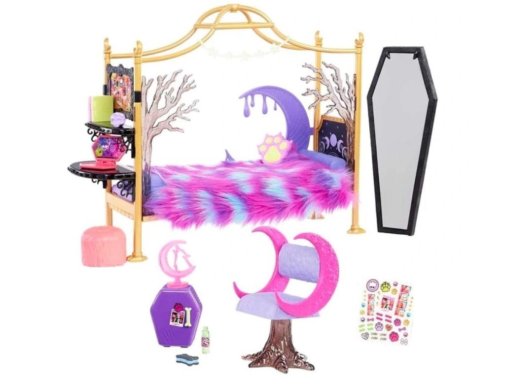 Ložnicový set Monster High™ Clawdeen Wolf™ má vše, co si vlkodlak může přát! Obsahuje parádní nábytek a dekorace, jako je postel, stůl, minilednička a funkční zrcadlo, a navíc spoustu doplňků pro vyprávění příběhů, se kterými si užiješ úžasnou zábavu. Navíc arch samolepek posouvá možnosti zdobení na úplně jinou úroveň. Panenka není součástí sady.