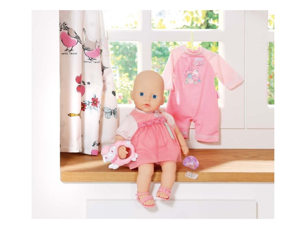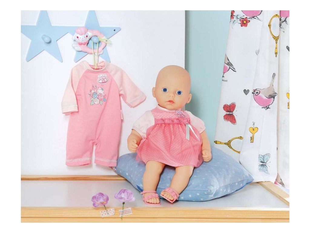 Panenka My First Baby Annabell ve speciální edici v dárkové krabici se dvěma oblečky. Domů si ji přinesete oblečenu do krásných růžových šatiček ozdobených růžičkami a jemnými puntíky, se kterými ladí i růžové sandálky taktéž ozdobené růžičkami. V balení si s sebou My First Baby Annabell přináší i dupačky, které může použít jako pyžamko nebo jako obleček na doma. Součástí balení je I chrastítko ve tvaru ovečky.