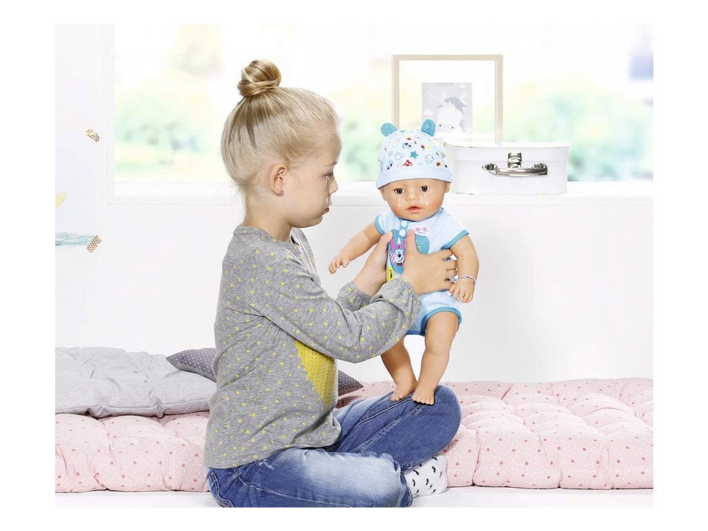 Panenka chlapec ve velikosti 43 cm s mechanickými funkcemi, které fungují bez použití baterií! Panenka roní slzy (po stištění hrudi), pije vodu z lahvičky, jí speciální kašičku, kaká, zavírá oči, má nově řešenou pohyblivost kloubů, pro snadné oblékání. Má nově řešené tělíčko z příjemného materiálu a ukrytý pupíček pod „kůží“. Panenka je vodotěsná je možné ji koupat. Součástí balení je mnoho doplňků: bodýčko, čepička, talířek se lžičkou, porce kašičky, lahvička, nočník, plenka, dudlík se sponkou, rodný list, náramek přátelství pro panenku a její malou maminku