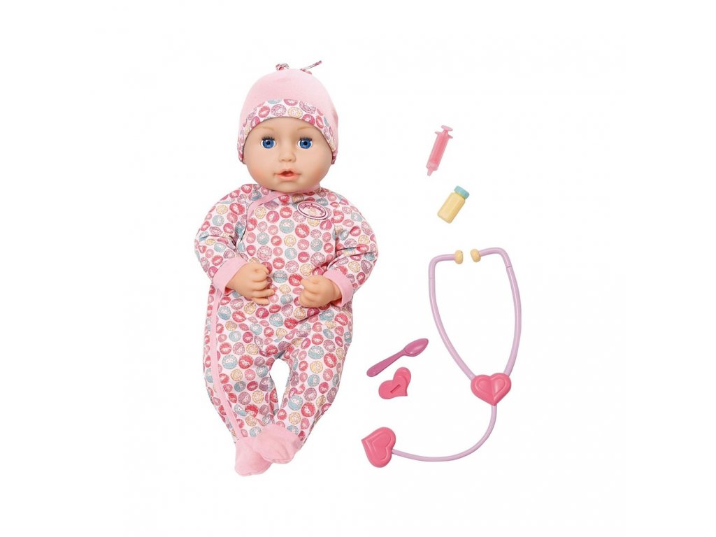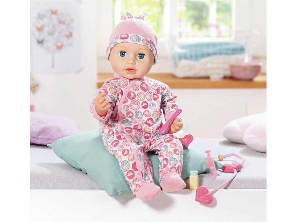 Zapf Creation Baby Annabell Nemocná Milly je panenka s měkkým látkovým tělem, vinylovou hlavou, vinylovými pažemi a nohami. Dodávána je s kloboukem a mnoha doplňky, jako jsou stetoskop, lékařská lžička, teploměr a další. Její velikost je 43 cm a má pevné oči.